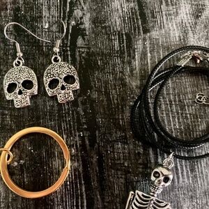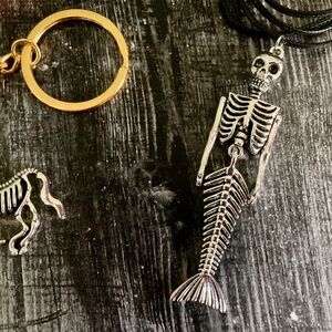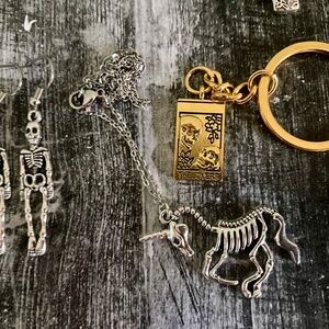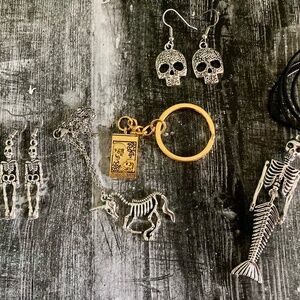 Skeleton jewelry keychain, necklace and earrings set. Purchase comes with two necklaces - One skeleton mermaid necklace on a cord necklace and one unicorn skeleton necklace on a steel cable chain. Two different sets of skeleton earrings with steel earring hooks. One the lovers tarot card gold color skeleton keychain. All brand new handmade by me!