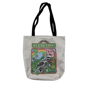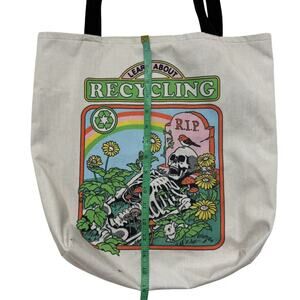 Skeleton “Learn About Recycling” RIP Grave Spooky Tote Bag. Whimsical & adorable garden grave scene with a skeleton at their gravestone and various flowers and mushrooms growing in and around the skeleton. Small dark spot and bottom and minor piling. In otherwise very good condition with only minor signs of normal wash/wear — no rips or holes.