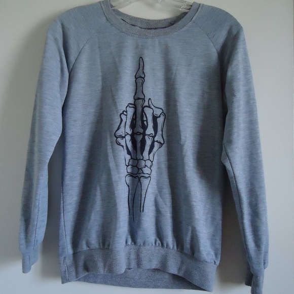 This is a brand new and never worn, long sleeved shirt with a skeleton giving the world a middle finger. It is very comfortable and falls just above your hips. Offers are welcomed!