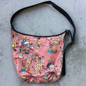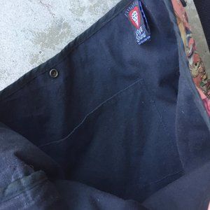 Fun printed cloth bag by Love Shine. Snap closure. Black lining, Inside pocket. 13"H x 15"W. Adjustable to 40"L 1.5"W Shoulder strap. There is some dirt and wear on the base, may wash off.