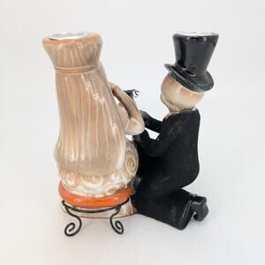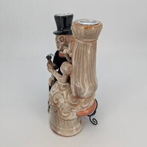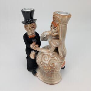 Bring a touch of gothic romance to your home with this charming and highly sought-after Yankee Candle Boney Bunch Skeleton Wedding Couple candle holder. A beloved piece from a retired collection, this intricate ceramic figurine features a skeleton bride and groom, in a surprise moment; ready to hold two taper candles.