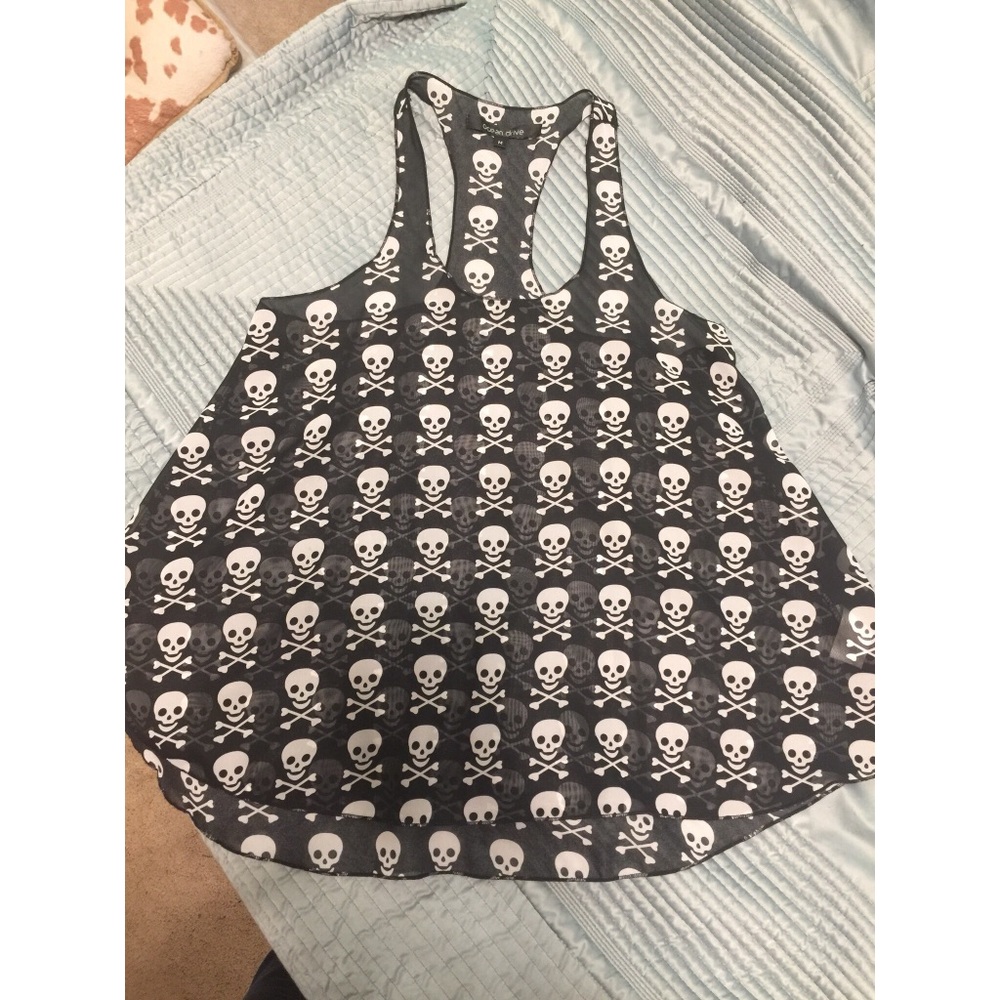 Never been worn, sheer, racer back top. Perfect with a black bra or bando. Perfect for Halloween! Runs small. If your bra size is anything bigger than a B 34 this won’t fit you.