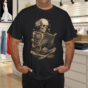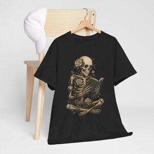 Skeleton Reading Flowers Creepy Halloween Black T-Shirt