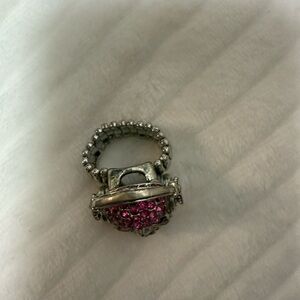 Ring with Pink Rhinestone embellished Silver Skeleton /Black Rhinestone eyes . Skeleton is wearing moveable headphones and is fastened to a stretchy band. Fits size 7, 8, 9 and can accommodate even larger sizes due to the elasticity of the band. Such a cool accessory to add to any outfit .