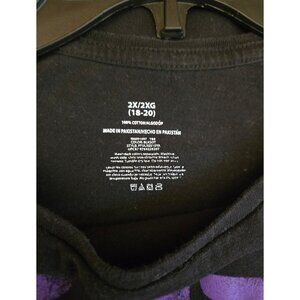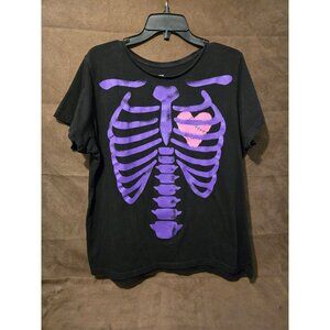 Black t-shirt with a purple skeleton rib cage graphic and a pink stitched heart. Womens 2X