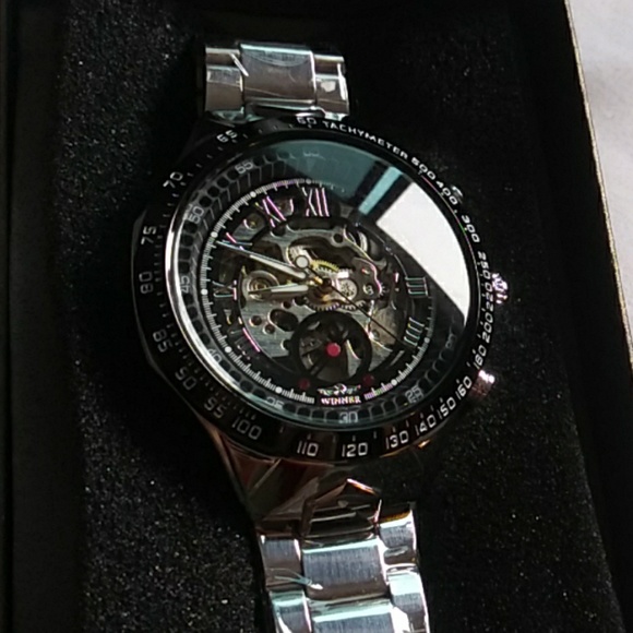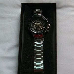 Men's silver skeleton watch, gears and Roman numerals visible on the face. Silver plated, has a decent weight and makes a beautiful gift!