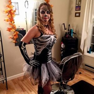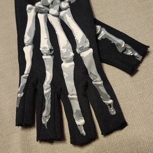 Halloween skeleton gloves. They were gently worn one time for a Halloween party. In good condition. the fingertips of the gloves have been intentionally cut off so that you can access your phone screen. colors are black, white, and gray, and it matches a skeleton costume I also have for sale.