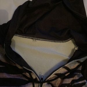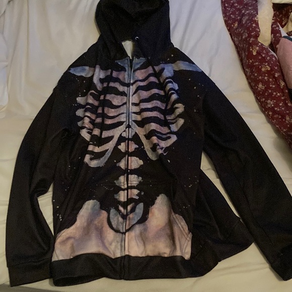 Perfect condition I ordered it and just never wore it. it’s a black zip up with bones down the rest the jacket
