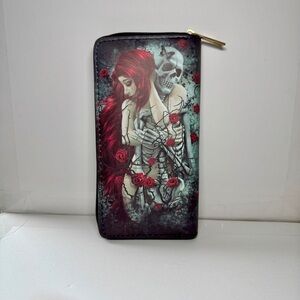 Stylish wallet with a striking skeleton and roses design. Features red and black tones with a gold zipper. Three enclosures, with many slots for cards and zippered area. NWOT. Made of vinyl.
