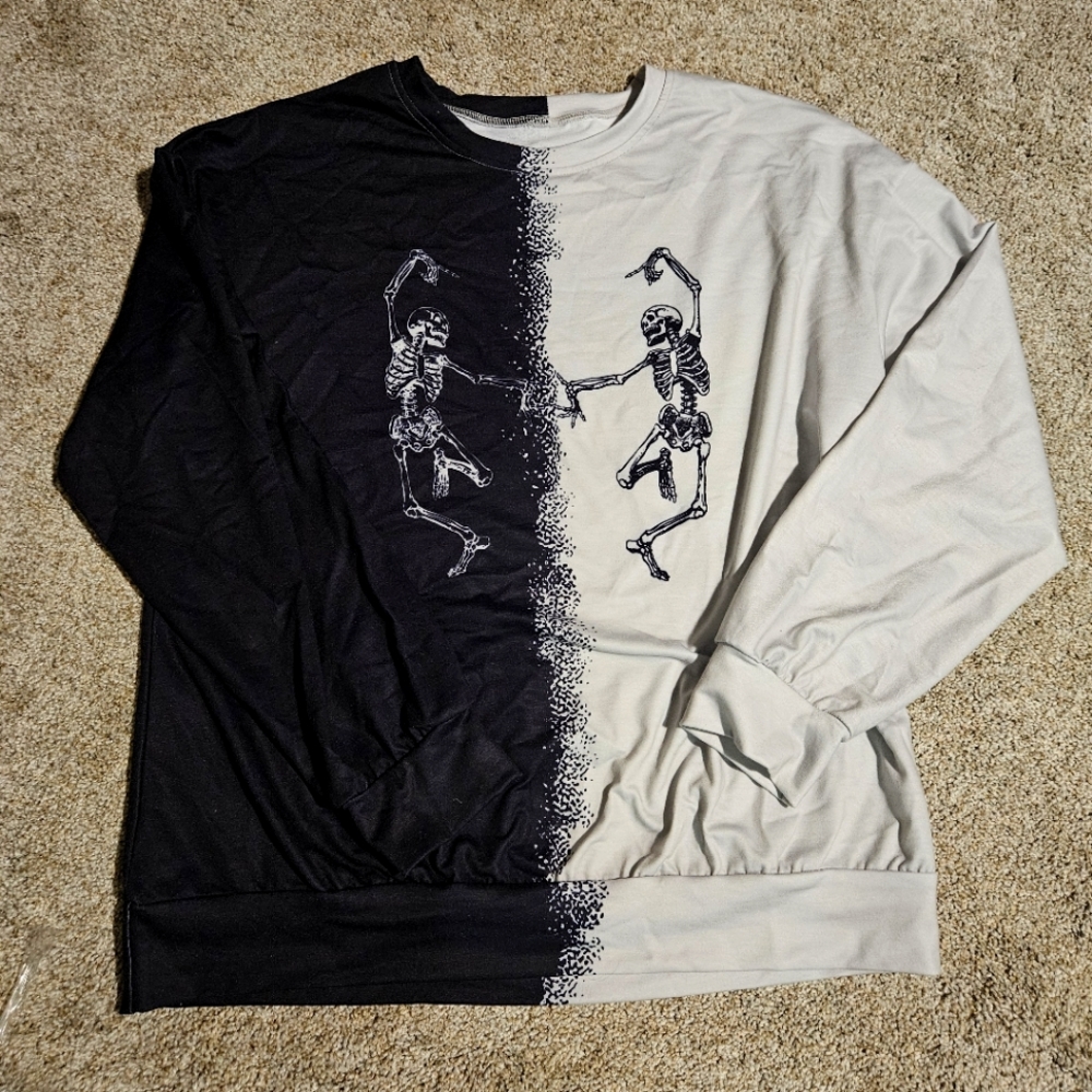 skeleton sweatshirt top. polyester. never worn with no tags but still in bag. took out for picture