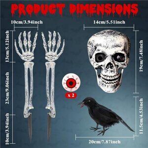 Package Include: 1 skeleton head, 2 arm bones, 2 red eyeballs and a crow. The joints of the arms and the mouth of the skull can be flexibly adjusted to the angle you want.