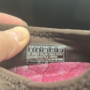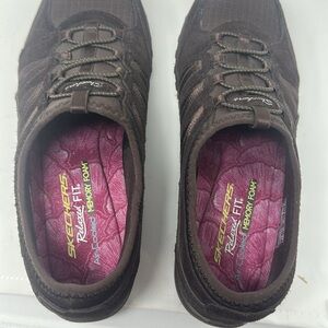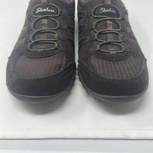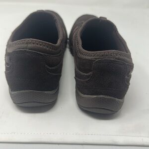 Preowned. Elastic laces. Noticed damage to logo on left shoe as pictured. Relaxed fit air cool memory foam insoles. Brown suede. Normal wear on bottom as picture.