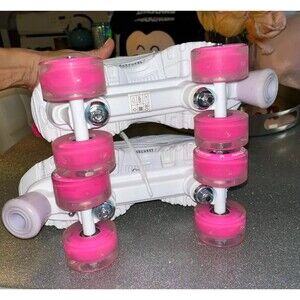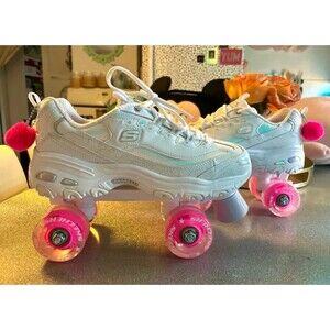 This listing is for a pair of brand new women’s sketchers four wheeler fly cruiser sneaker/skate in size 8. These rollerskates are white in color with pink light up wheels. The sneaker part of the skates, have an iridescent tone to certain parts of them. These skates are super cute. Brand new have not been used. I offer an additional discount for bundled items of mine so check out my other listings.