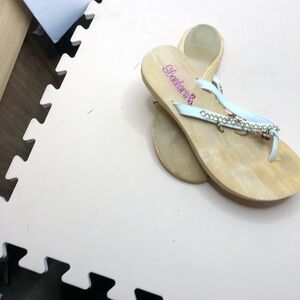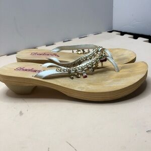 s)Cute sketchers sandals with rubber bottoms 1 inch heel cushioning between the toe tops in embellished with little figurines