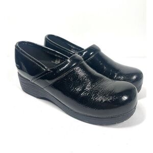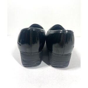 Black patent leather slip on clogs