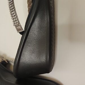 -Gold with silver rhinestone criss cross straps across top of shoe