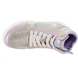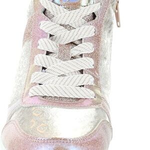 Stylish iridescent high-top sneakers from Sketchers. Rose gold with a cool leopard print design. Features a side zipper and lace up front.
