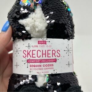 Sketchers Panda Sequin Cozy Socks Girls Size L/XL Black and Cute with Pink Bow (Size 13-3)