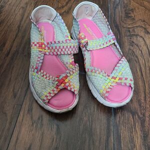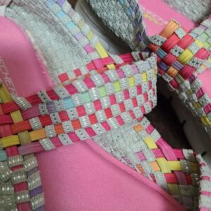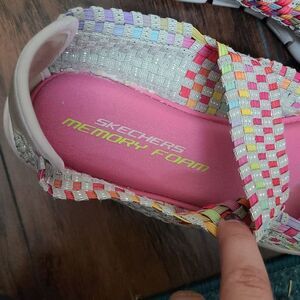 This is a pair of lightweight memory foam open toed shoes by sketchers. They have a multicolored and sparkly woven top and a pink memory foam interior. Note there is some wear on the bottom of these shoes. The size tag is missing except for one small part that I believe means they are a size 9 based on Sketchers international sizing.