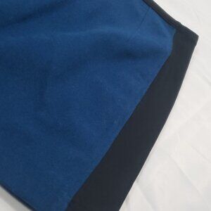 Skhoop fully lined, insulated mini skirt. Designed in Sweden. Woman-owned company. Shell is 50% wool, 60% polyester Lining is 100% Polyester. Gorgeous royal blue and black colorblock with zipper down one side. Slight stretch at the waist. Waist is 31 and 1/2. Length is 16 inches.