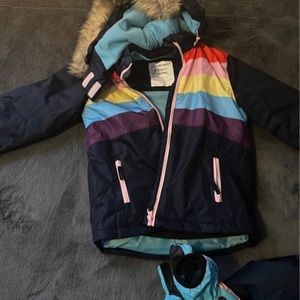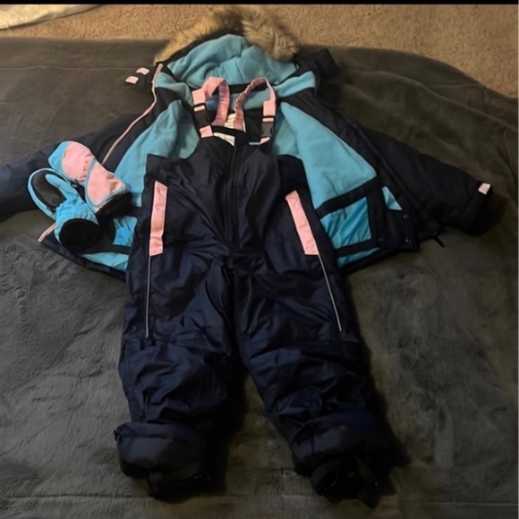 Top is size small (7-8)bottom is medium (8-10)and mittens are small Excellent condition! Fits like a kids 8-10