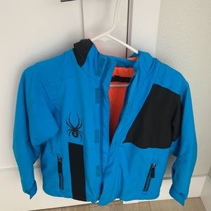 Blue ski jacket with hoodie for boys has 2 big pockets with zipper in the fron sides , 2 tiny pockets on the sleeves & small mesh one inside the jacket , big mesh on the other side of the jacket