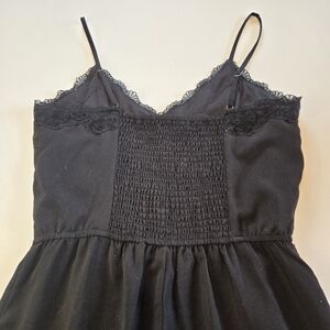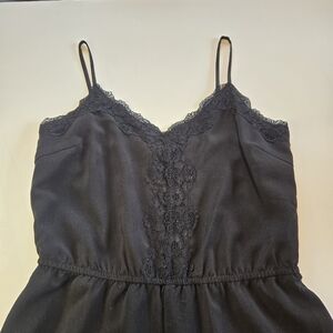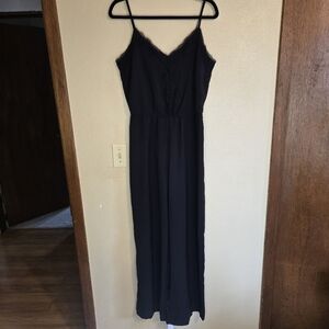 Skies Are Blue black pantsuit with lace trim around the bodice. Features adjustable spaghetti straps and a flattering fit. Wide leg pants will pair well with heels or boots. Only worn one time, she's ready to hit the town with you!