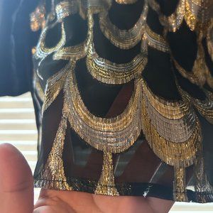 Reposhing this item I purchased from @holly_hartley. Loved it, but ready to rotate for something new. Beautiful and flashy blouse, black with woven gold detail in the front.