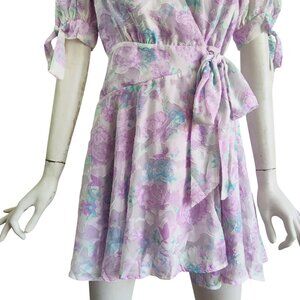 Pretty pastel floral wrap dress with puffy bow tie cuff sleeves, tied waist, and flirty flowy skirt giving femme coquette vibe