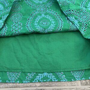 Excellent used condition women’s Skies Are Blue Eyelet Embroidered Off the Shoulder Mini Dress in green and blue. No stains or flaws.