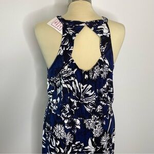 Skies Are Blue floral maxi dress. Navy blue and white floral print dress with v-neck front, keyhole cut out on back, elastic waist and side slits in skirt. Slits measure 18" in length. New with tags.