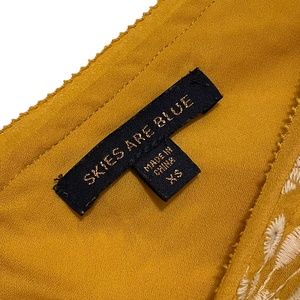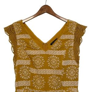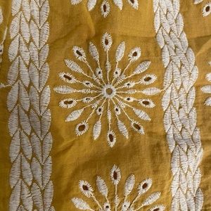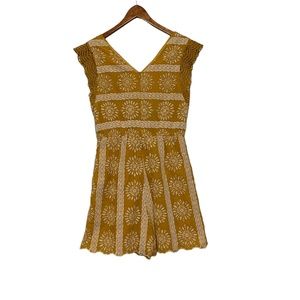 V-Neck romper in mustard/gold yellow with white embroidery eyelet pattern