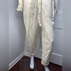 This Skies Are Blue jumpsuit in a sophisticated cream hue features a relaxed utility-style fit with a belted waist for a polished look. The wide-leg pants and collared neckline add a modern touch, making it perfect for both casual and refined occasions.Pictured as is. NWT. Theres a tiny spott on them that will probably come out hardly noticable.