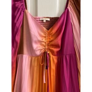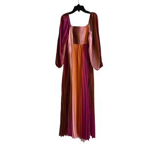 Size small. Measurements are 54” from shoulder to bottom, 16” pit to pit, 22” sleeve length. Gorgeous gradation striped with pleats. V neck bodice with adjustable tie drawstring. Elastic back with side zipper closure. 100% polyester.