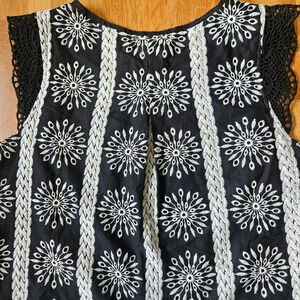Skies Are Blue top, size Medium. Black & white embroidered boho design with crochet trim accents. Perfect for festival looks or casual summer layering. In excellent pre-owned condition. See photos for measurements.