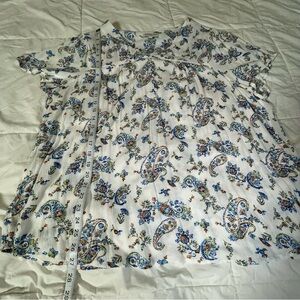 Elevate your wardrobe with this stylish floral paisley print top. Perfect for any occasion, this top features a beautiful blend of blue and white colors. A must-have for fashion-forward individuals. Fits like a 2XL. Good preowned condition.