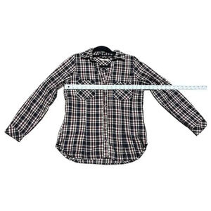 Skies Are Blue Women's V-Neck Maroon Navy Plaid Shirt Roll Tab Sleeve Size M