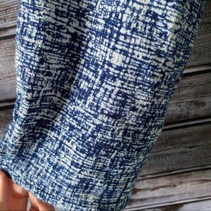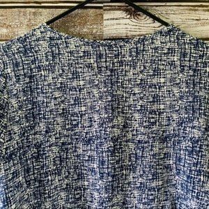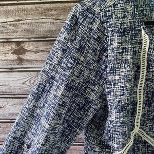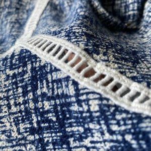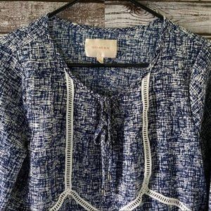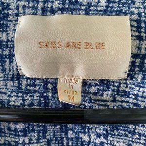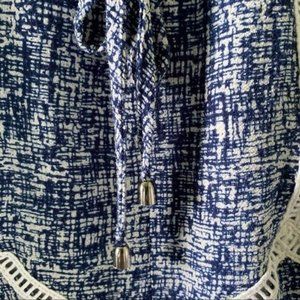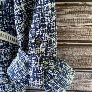This Women's Blouse by Skies are Blue is a Size M and is made of 98% Polyester and 2% Spandex with a 100% Polyester Lining. It has a blue and white pattern with a white crochet-like detailing, a tie at the neckline and tab sleeves that can be worn rolled up or down. Gently used. Great Condition!