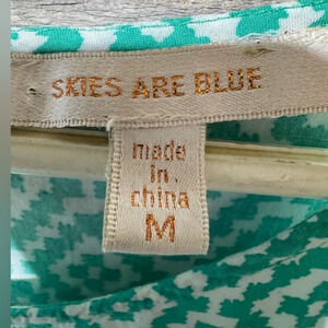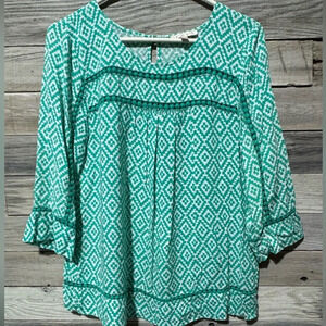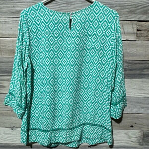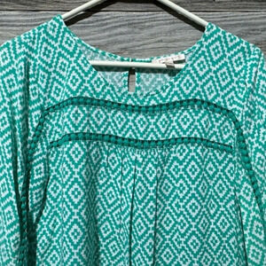 Pull Over. Back Button Keyhole Closure. Inset Crochet, Ribbon Details. All Over Print, Geometric, Batik, Diamond Pattern. Lightweight. Relaxed Fit. Green, White. Size Medium.