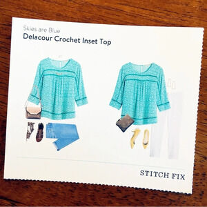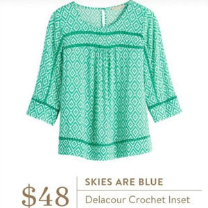 Skies are Blue, Stitch Fix Top, Shirt, Blouse. Delacour Crochet Inset Style. Round Neck. 3/4 Length Sleeves.