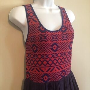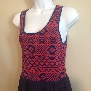 Navy & Blue Geometric Pattern Top that falls into an loose, airy navy skirt. Waist and top have stretch to it.