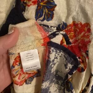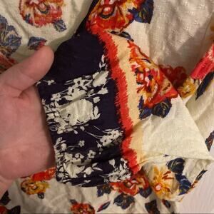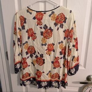 Skies are Blue Floral Peasant Top w/ Lace Detail and mixed prints. 3/4 sleeves with bubble hem on the sleeves, 100% rayon.. Women’s size small. Cream / off-white background. Black lace v-cut detail. Length down center back measures approx 24 in. Pit to pit measures approx 18 in. Shirt is in very good used condition with no flaws or stains and minimal wash wear. Please see close-up pictures for condition details. Lightweight. Boho. Bohemian.