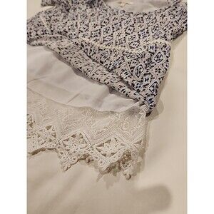 Skies are Blue Langlock Cold Shoulder Small Top White/Blue Geometric Crochet