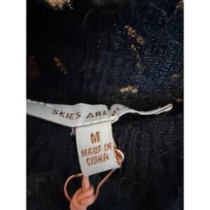 The product is a trendy chic black sweater by Skies are Blue in size medium. It features a see-through jagged collar, long sleeves, and a pullover style, making it perfect for casual occasions during the winter and fall seasons. The knit fabric adds a touch of warmth, while the regular fit ensures a comfortable and stylish look for women looking to add a fashionable piece to their wardrobe.