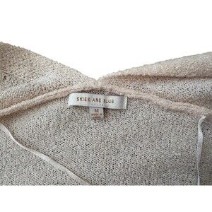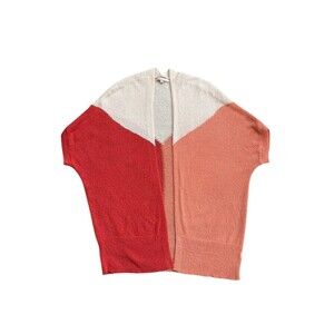 This is a Skies are Blue short sleeve cardigan for women in a size medium. It is an open front cardigan with a multi-color block design in shades of orange. The fabric is a knit blend of 67% acrylic and 33% nylon, making it perfect for all seasons. Featuring pockets, a raglan sleeve, and a comfortable fit, this stylish and cozy cardigan is ideal for casual, workwear, or travel occasions.