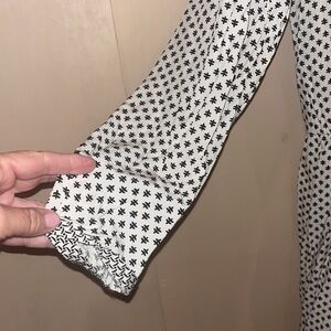 Has roll tab sleeves, cream color base with black design, has embroidery details. Gathered waist. Measurement pit to pit is 22” inches, waist un stretched is 20” inches and length is 31” inches. Very sweet dress, fully lined inside. Styled like a shirt dress. Roll tab sleeves for versatility.