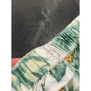 in excellent pre-owned condition. such a light and breezy top for summer or spring. white background with a calming display of green leaves and golden flowers.