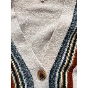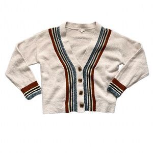 Very soft cream colored cardigan with multi colored stripes , v neck with large button closure, boxy style