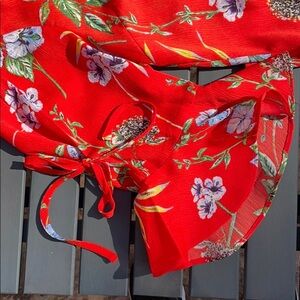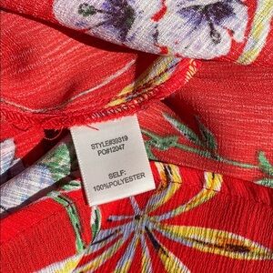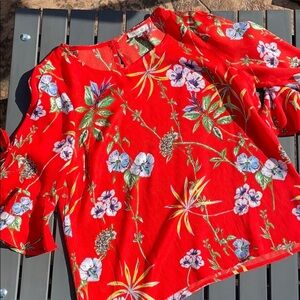 From Stitch Fix, this floral top has flutter/bell 3/4 length sleeves that tie. Key hole on back with button. Worn only once, in excellent condition. This is a size Medium top but fits more like a size Large to me. Check measurements below.