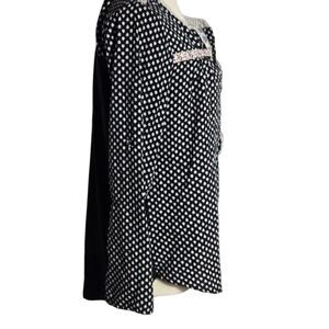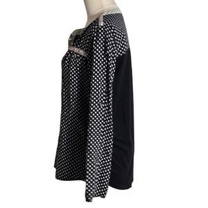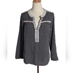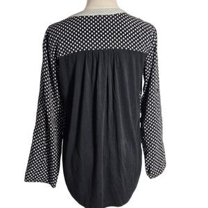 Pretty boho top. Front is black and white with embroidered collar. Back is black and stretch Wear with pants or skirts. Good overall condition